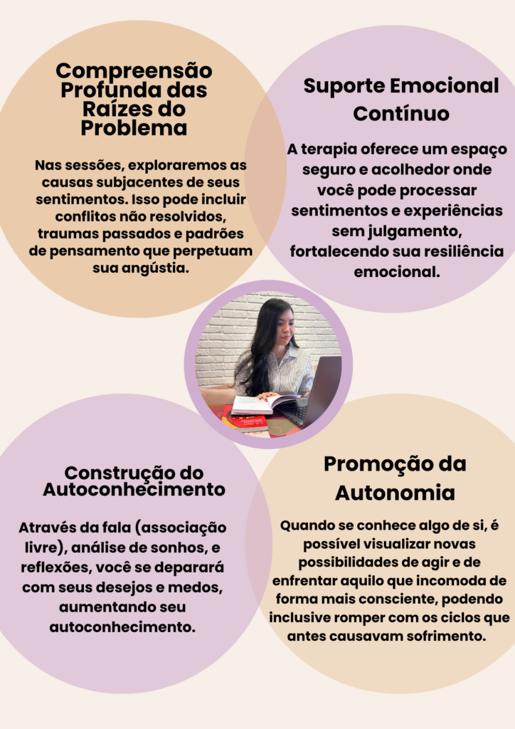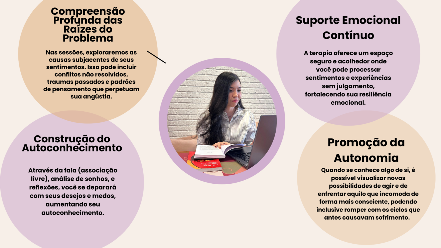 Criada por Sigmund Freud, a Psicanálise é uma forma de psicoterapia que explora como nossa mente funciona, especialmente aquilo que não percebemos conscientemente, chamado de inconsciente. Ela foca em como nossa infância e experiências influenciam em quem somos. Durante as sessões, conversamos para entender melhor nossos pensamentos e sentimentos. O objetivo é trazer à tona coisas que estão escondidas em nossa mente para nos conhecermos melhor e melhorarmos nossa vida.